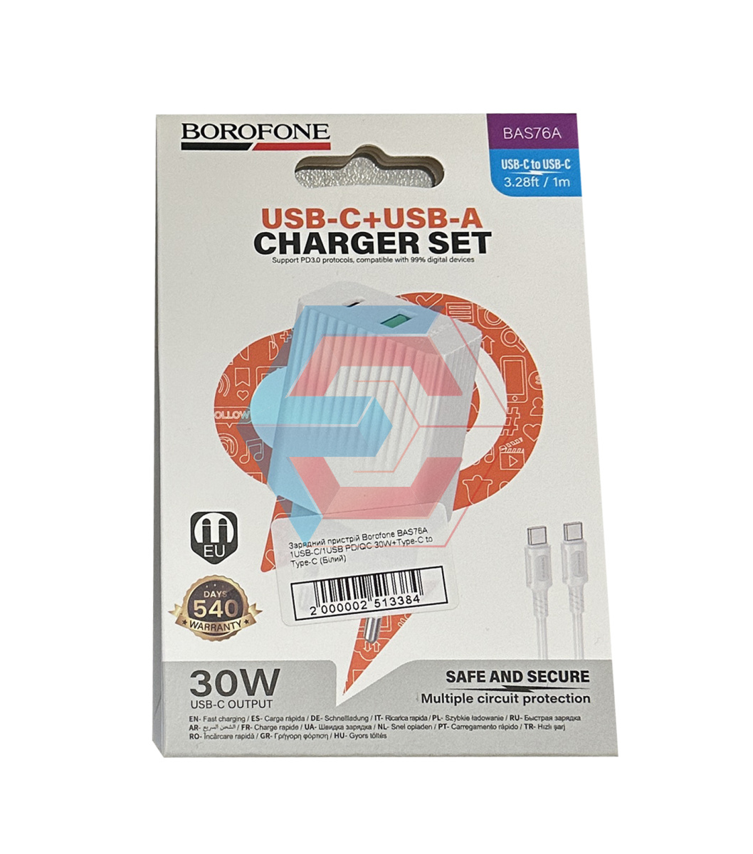 Зарядний пристрій Borofone BAS76A 1USB-C/1USB PD/QC 30W+Type-C to Type-C (Бiлий)
